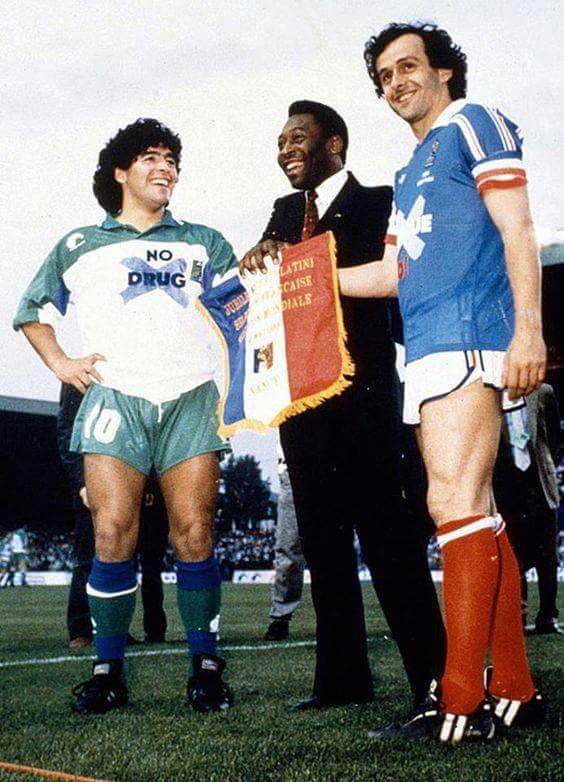 Se si guarda oggettivamente questa foto quello che si vede è nientemeno che il calcio: Pelé, Platini e Maradona tre fenomeni quanto di meglio può offrire questo sport.